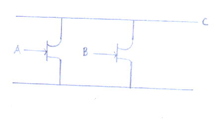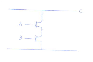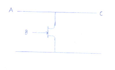 Let's say you had a situation where there was a current on the top, and the bottom was grounded. We assume there's a current on A. If there's a current on B also, the current will drain from A to the ground, leaving no current on C. If there's no current on B, this will not happen, and there will be a current on C. This is a thing where it makes it the opposite. This is called a NOT gate, where A is converted into NOT A.