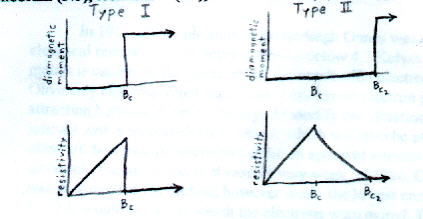 There are two types of superconductors, simply called Type I and Type II. In Type I, the transition between normal and superconducting is very abrupt. In Type II, it's more gradual. Most superconducting elements are Type I. Most alloys, and also elements niobium (Nb), technetium (Tc), and vanadium (V), are Type II.